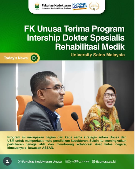Fakultas Kedokteran Universitas Nahdlatul Ulama Surabaya (FK Unusa) menerima program internship dari Dr. Al Hafiz bin Ibrahim, spesialis rehabilitasi medik dan dosen Universiti Sains Malaysia (USM). Selama enam bulan, ia akan menjalani program di Unusa dan Rumah Sakit Haji Surabaya.
