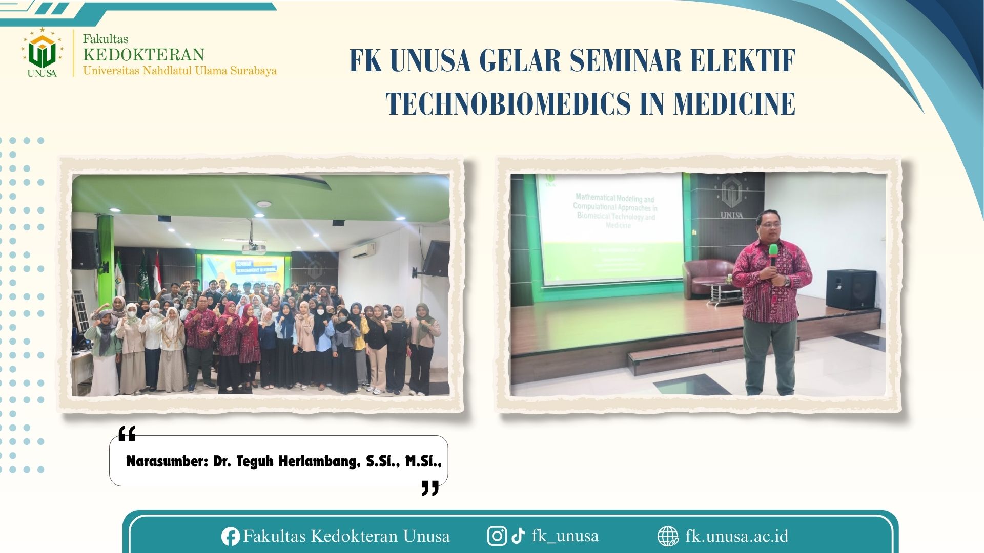Surabaya – Fakultas Kedokteran Universitas Nahdlatul Ulama Surabaya (FK UNUSA) sukses menyelenggarakan seminar Modul Elektif bertajuk “Technobiomedics in Medicine” pada Rabu (17/12). Seminar ini mengangkat tema strategis di era digital, yaitu “Mathematical Modeling and Computational Approaches in Biomedical Technology and Medicine.”