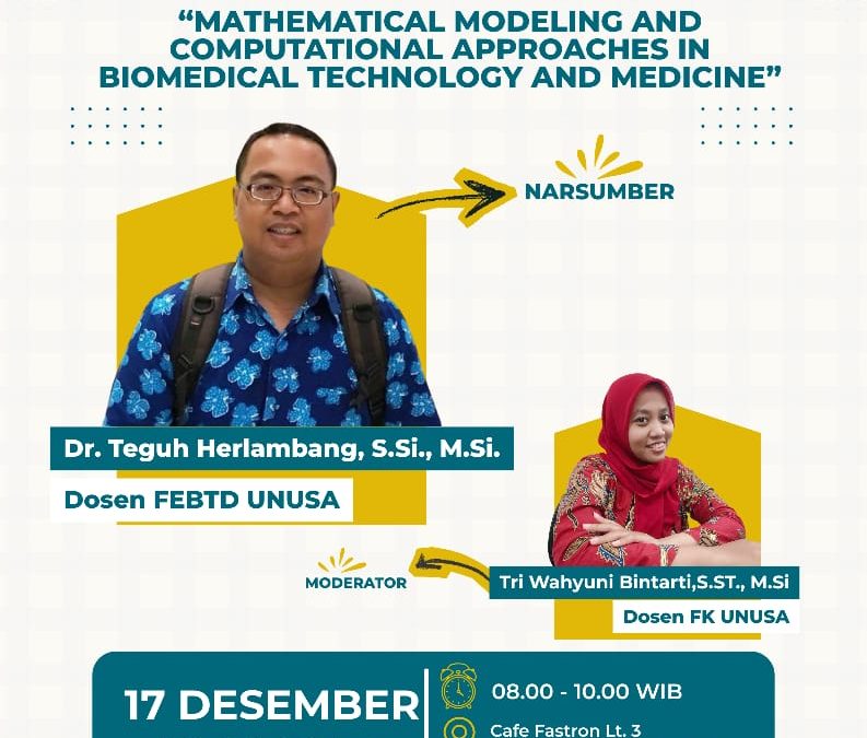 Acara yang berlangsung di Cafe Fastron UNUSA Tower ini menghadirkan narasumber ahli Dr. Teguh Herlambang, S.Si., M.Si. (Dosen FEBTD UNUSA), seminar ini mengulas tuntas aplikasi model matematika dalam solusi klinis. Diskusi berlangsung interaktif di bawah panduan moderator Tri Wahyuni Bintarti, S.ST., M.Si (Dosen FK UNUSA).